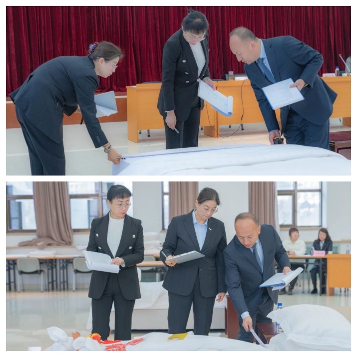 評委們認(rèn)真檢查選手做床完成情況,從鋪床準(zhǔn)備、操作規(guī)范等方面進行綜合評判。